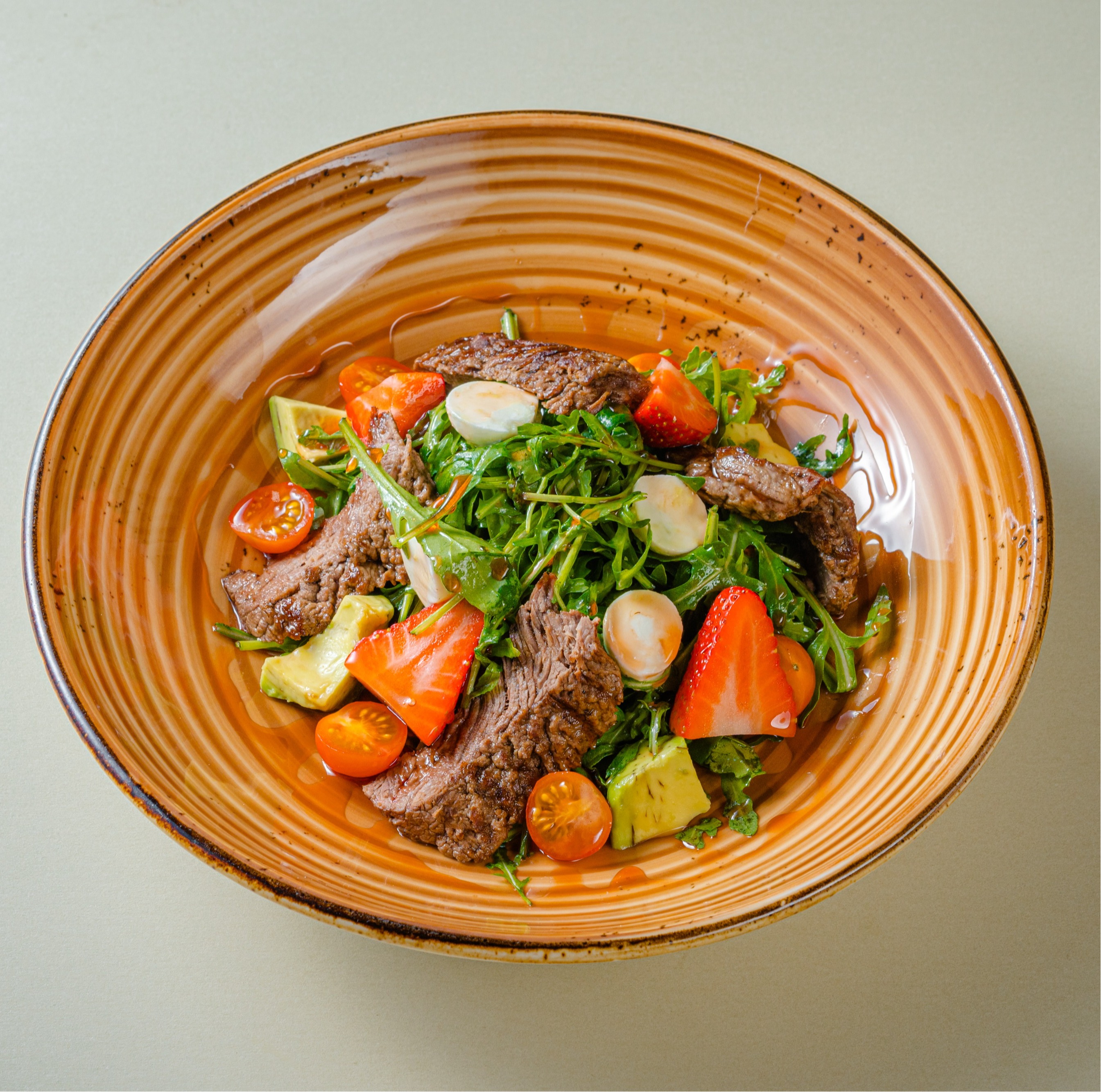 с говяжьей вырезкой,клубникой и моцареллой